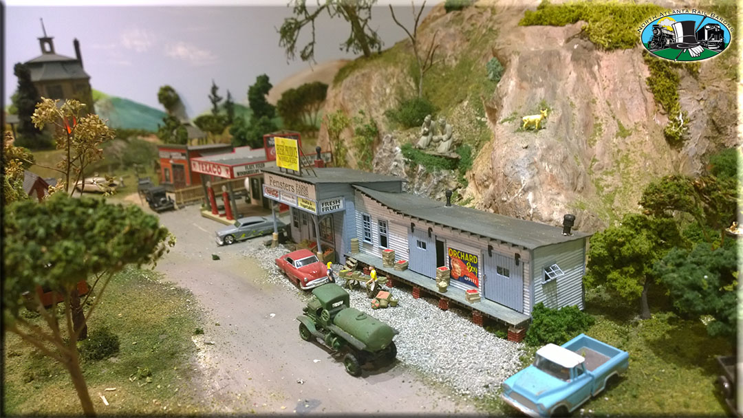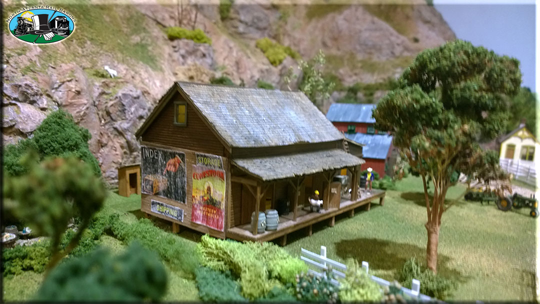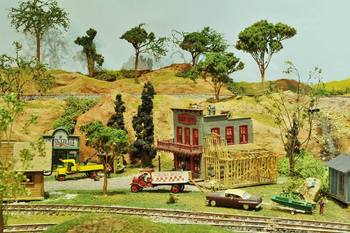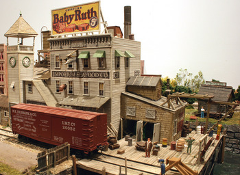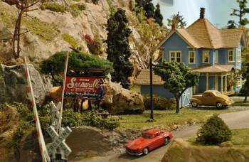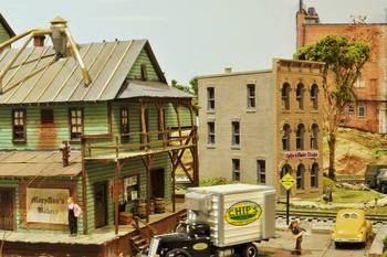 The village of LittleTowne contains numerous structures, all of which are built from wood kits - except one . When you have the opportunity, see if you can identify the plastic structure. The town is lighted and has automatic grade crossing gates and sound modules.