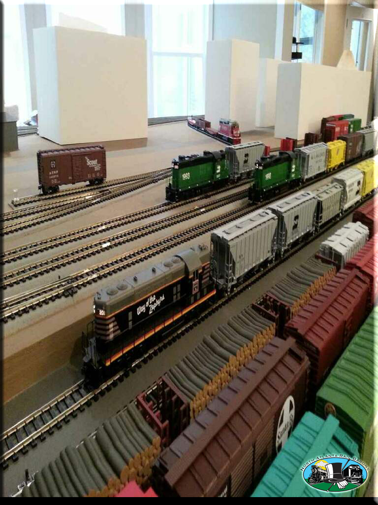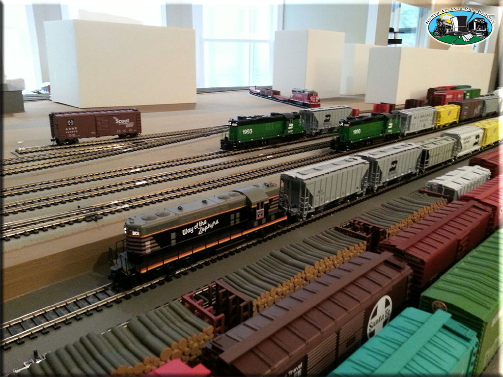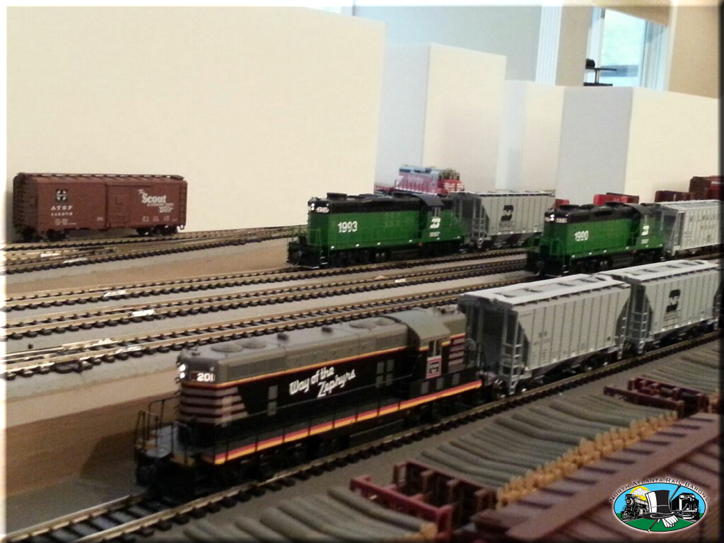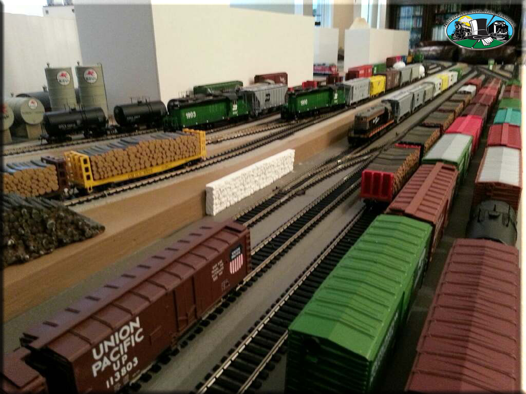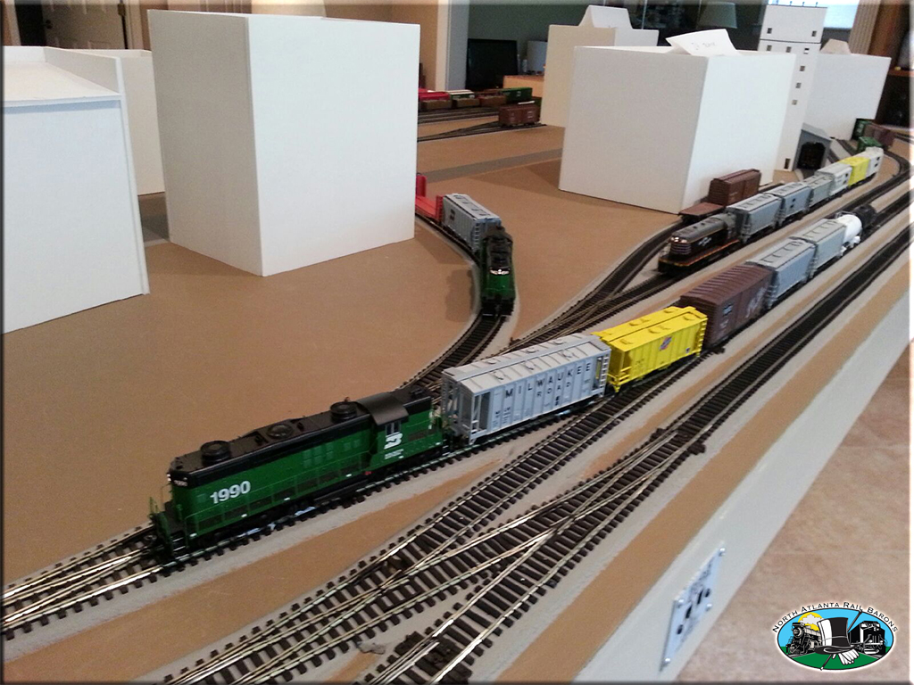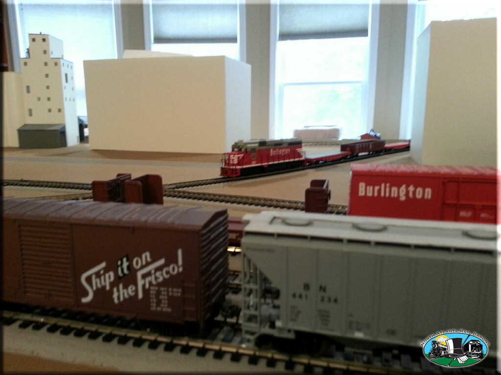 Locomotive power is mostly Proto 2000 GP-7's, GP-9's, GP-18's, GP-20's, and GP-30's. Switchers are Stewart VO-1000's and SW9/1200's. Road names are CB&Q, BN, GN, FRISCO, and Santa Fe. Rolling stock is mostly Atlas Blue Box Kits, and every rail car is equipped with metal wheels and Kadee couplers.