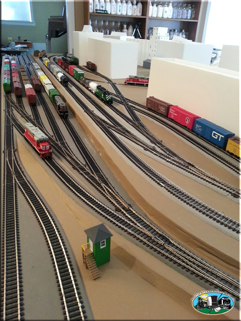During the first few sessions with The North Atlanta Rail Barons, the benchwork for a 5-1/2' x 12' HO layout was almost complete. The subroadbed is 1/2" sandply supported by a 1" x 4" cypress frame. The layout is mounted on casters in order to easily move it around the basement when necessary.
