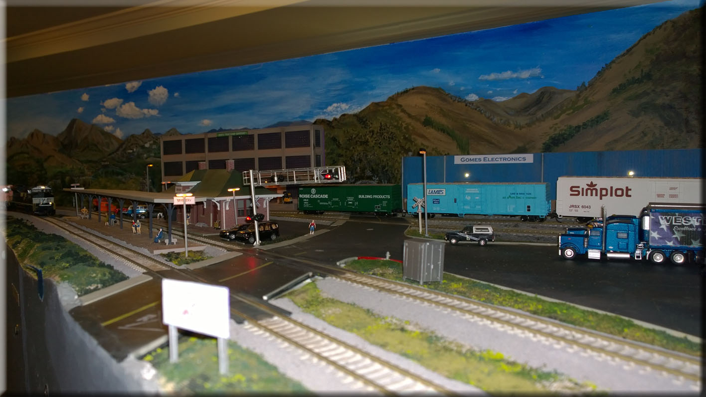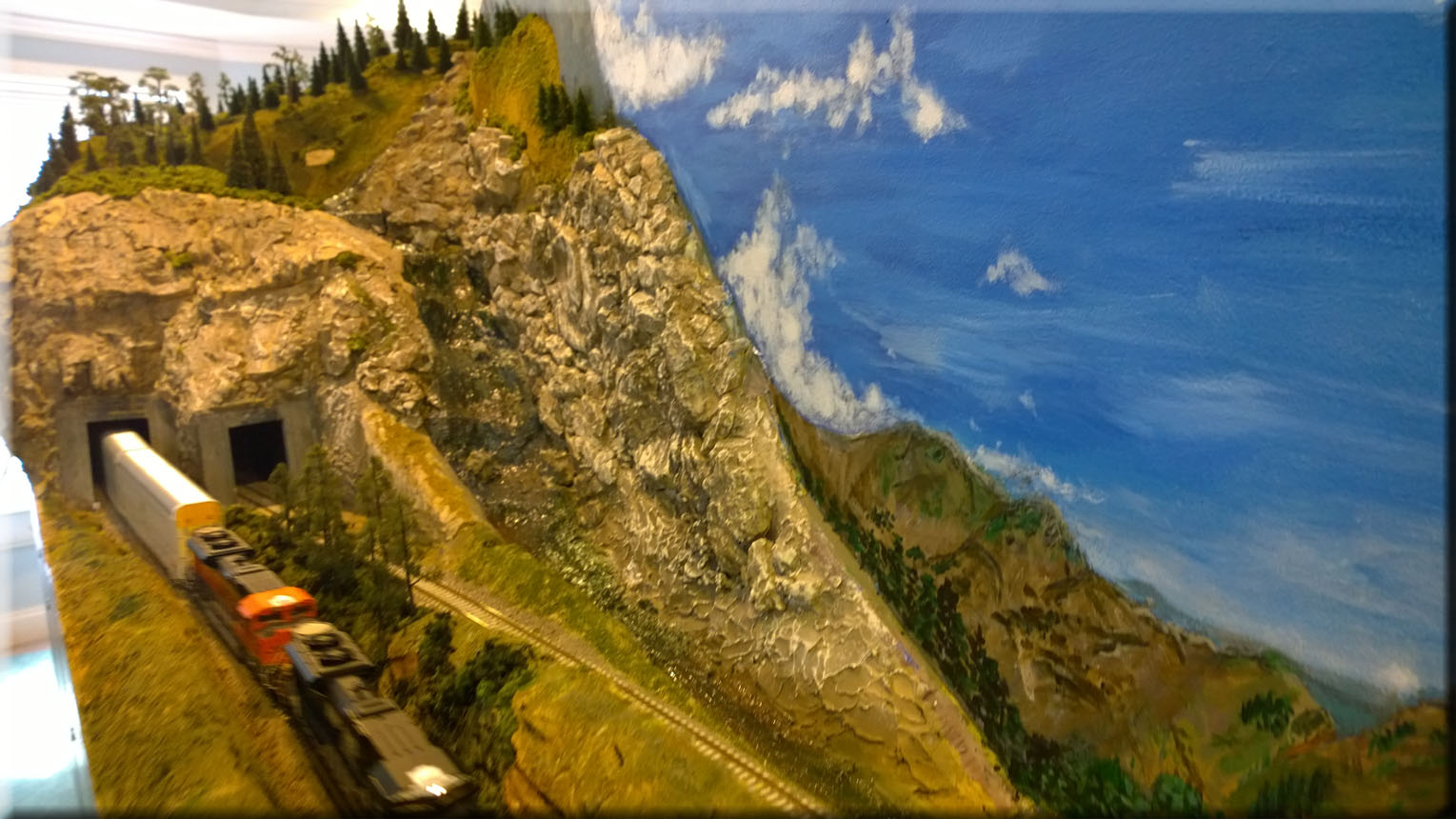 The three-hour event stretched into almost four hours with late-comers arriving near the scheduled closing time to view the operations of the trains and the superb scenery. Perry's late wife Michelle painted the wonderful backdrops and helped with scenery installation, and the Rail Barons have assisted with planting trees, paving roads, and pouring concrete among other things. All of the pictures below are clickable for a more detailed view.