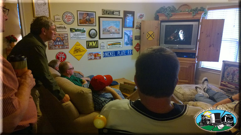 The Littletowne Railroad occupies a space of 9 by 18 feet, and while waiting for a train, members occupy the adjacent Crew Lounge enjoying refreshments and whatever railroad video is playing on the TV.