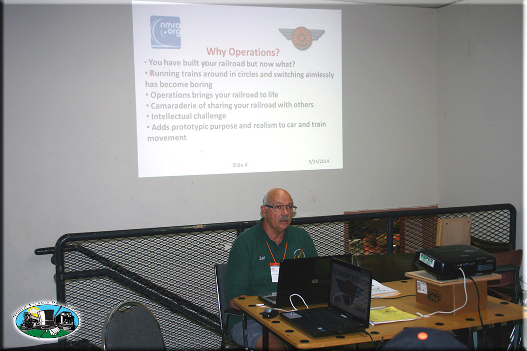 This clinic covered various aspects of Model Railroad Operations, presented by lead clinician Bill Raymond, assisted by Walt Liles and Howard Goodwin, all members of the North Atlanta Rail Barons Operating Group. Basic concepts in starting and planning a model railroad with an understanding of operations incorporating prototype practices were covered as a means of expanding the enjoyment of the hobby.